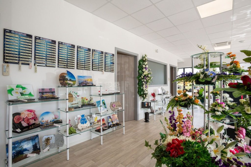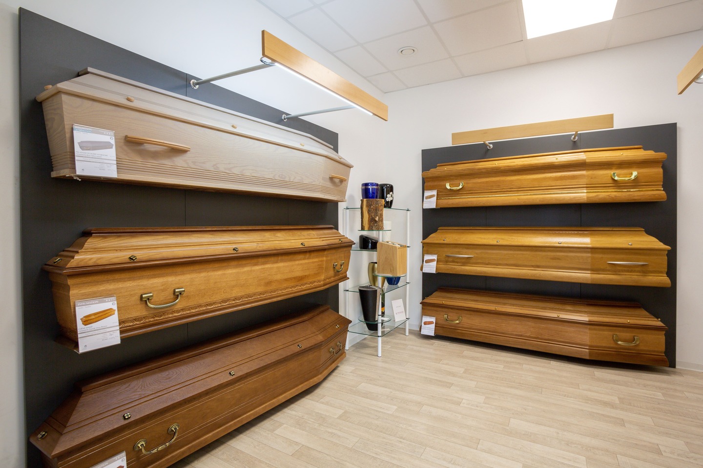 • – les articles : cercueil, capiton, urne, fleurs, plaques;